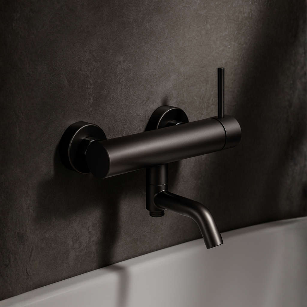 Bateria wannowa w matowym czarnym wykończeniu o nowoczesnej, minimalistycznej formie. Wykonana z trwałej stali nierdzewnej AISI 304, wyposażona w ceramiczną głowicę i perlator napowietrzający. Przeznaczona do montażu ściennego, idealnie komponuje się z nowoczesnymi wnętrzami.