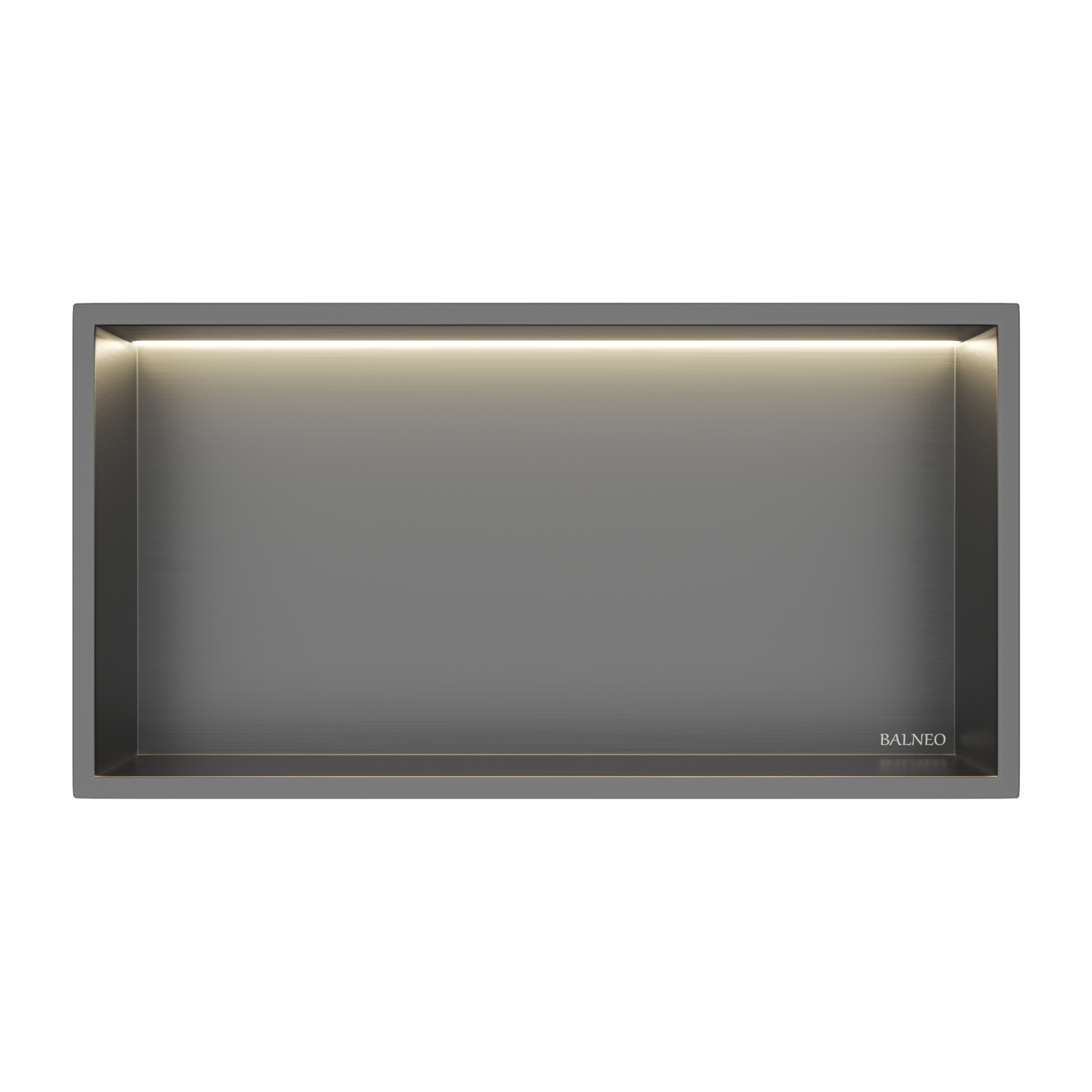 WALL-BOX ONE to podtynkowa półka wykonana ze stali nierdzewnej w wykończeniu Gun Metal. Konstrukcja jest trwała, odporna na wilgoć i w pełni wodoszczelna, co umożliwia montaż w strefie prysznicowej. Podtynkowa forma pozwala zachować uporządkowaną przestrzeń bez zajmowania miejsca w kabinie. Zintegrowane oświetlenie LED podkreśla wygląd wnętrza i zwiększa funkcjonalność półki. Seria umożliwia pełne dopasowanie kolorystyczne do odpływów liniowych, listew spadkowych i pozostałych elementów systemu.