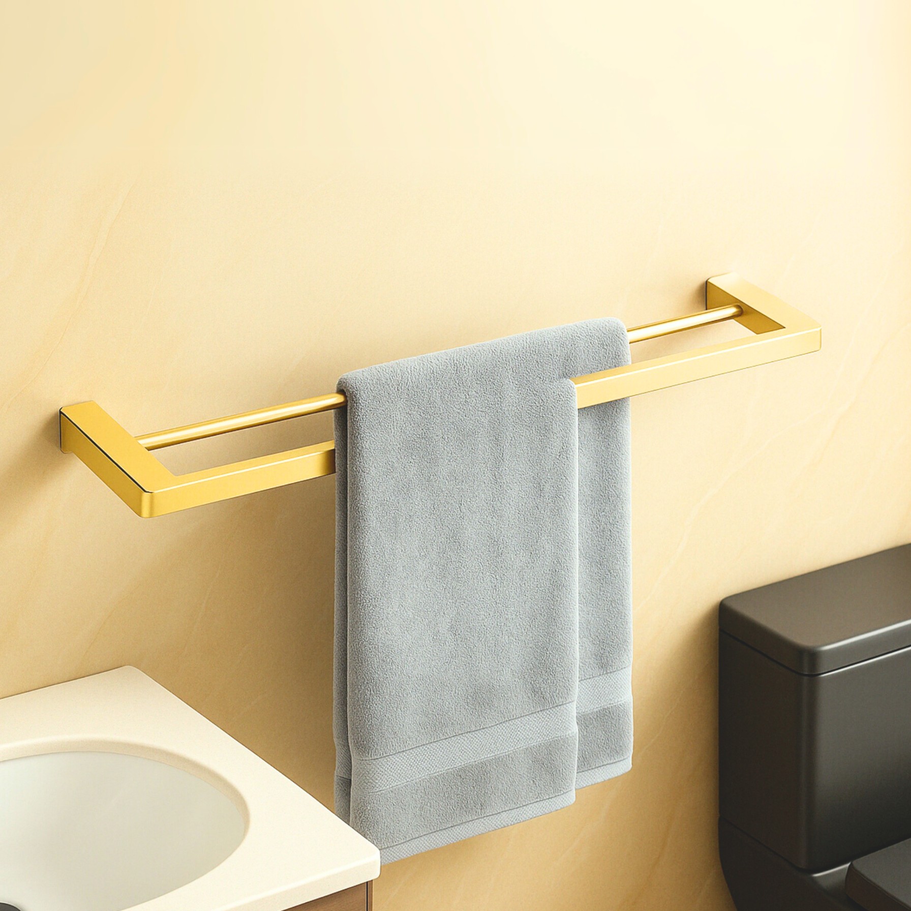 Wieszak łazienkowy Balneo QARX model 3 shiny gold to wyjątkowa propozycja dla wnętrz z nutą luksusu. Jego podwójna, płaska konstrukcja oferuje praktyczność w codziennym użytkowaniu, a lśniące złote wykończenie podkreśla prestiżowy charakter łazienki. Produkt został wykonany ze stali nierdzewnej AISI 304 odpornej na korozję i zachowuje trwałość nawet w warunkach dużej wilgotności.